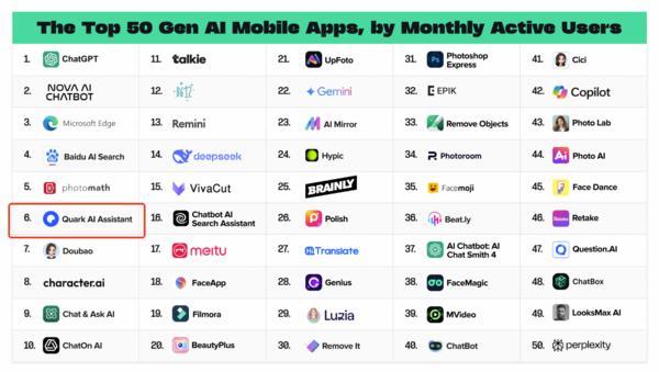 根據全球著名投資基金、諮詢公司 a16z 發佈最新一期的《2025 年全球 100 生成式 AI 消費級應用排行榜》顯示,在移動端 AI 應用排行榜中,夸克全球排名第六,成為躍升速度最快、最具競爭力的國產AI應用。