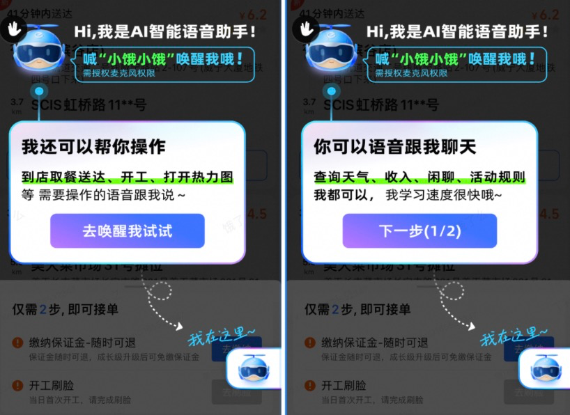 面向餓了麼藍騎士,“小餓”具有三大核心能力,一是語音交互與智能響應,支持語音喚醒,可直接完成接單、確認到店、查詢活動等操作,減少手動點擊步驟,提升操作效率;二是多維度主動服務,通過即時分析騎手位置、訂單狀態及環境數據,主動推送權益提醒(如福利領取)、天氣預警、路線封路提示等,降低配送風險;三是個性化智能分析,基於騎手歷史數據與周邊訂單熱力圖,提供“哪裏訂單多”“當前收入預估”等智能分析,幫助騎手優化接單策略。