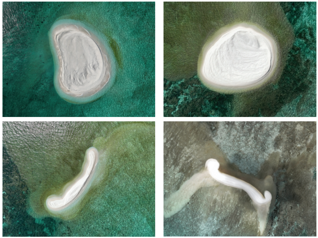 鐵線礁、牛軛礁4個高潮出露海面的沙洲現場照片(左上:鐵線礁1號沙洲;右上:鐵線礁2號沙洲;左下:鐵線礁3號沙洲;右下:牛軛礁1號沙洲)。
