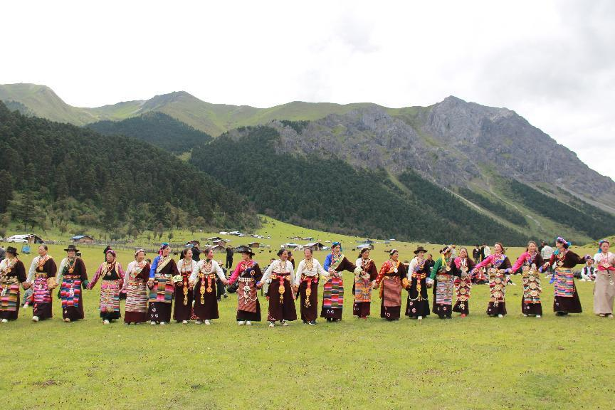 作品簡介:賽馬節期間,身着民族服飾的西藏女性羣體在草地上一字排開,歡騰起舞。