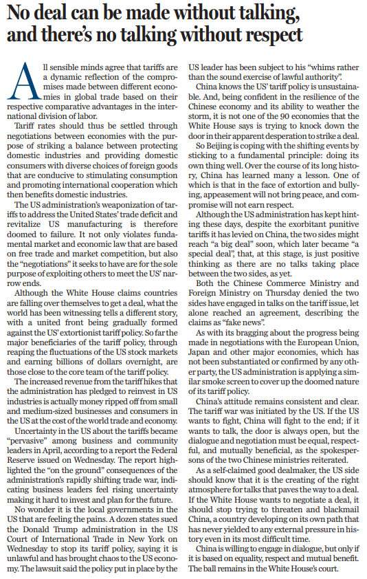 正如中國商務部及外交部發言人所重申的,這場關税戰是美方發起的,中方的態度是一貫的也是明確的:打,奉陪到底;談,大門敞開。對話談判必須是平等、尊重、互惠的。