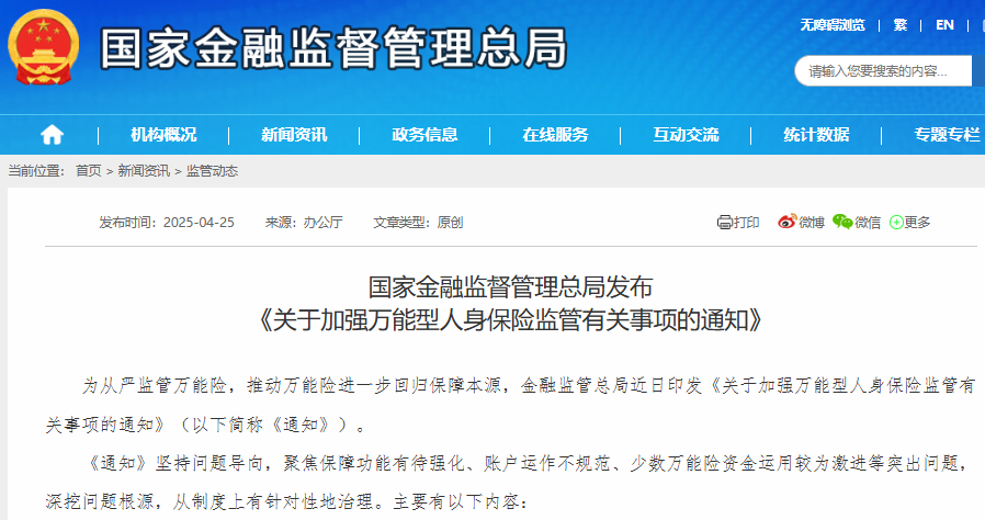 【環球網財經綜合報道】4月25日,金融監管總局發佈《關於加強萬能型人身保險監管有關事項的通知》(簡稱《通知》),對萬能險產品設計、賬户管理、資金運用等方面提出新的監管要求,是為解決保障功能有待強化、賬户運作不規範、少數萬能險資金運用較為激進等突出問題。此《通知》將於2025年5月1日起正式實施,現有不符合規定的萬能險業務需在2026年4月30日前完成整改。