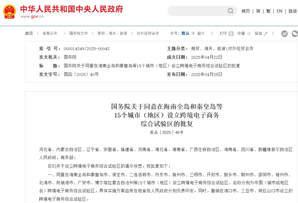 【環球網財經綜合報道】日前,《國務院關於同意在海南全島和秦皇島等15個城市(地區)設立跨境電子商務綜合試驗區的批覆》(國函〔2025〕40號,簡稱“批覆”)發佈,同意在海南全島和秦皇島市、保定市、二連浩特市、丹東市、滁州市、三明市、開封市、新鄉市、鄂州市、邵陽市、梧州市、北海市、防城港市、廣安市、博爾塔拉蒙古自治州等15個城市(地區)設立跨境電子商務綜合試驗區,並撤銷在海口市、三亞市、阿拉山口市設立的跨境電子商務綜合試驗區。