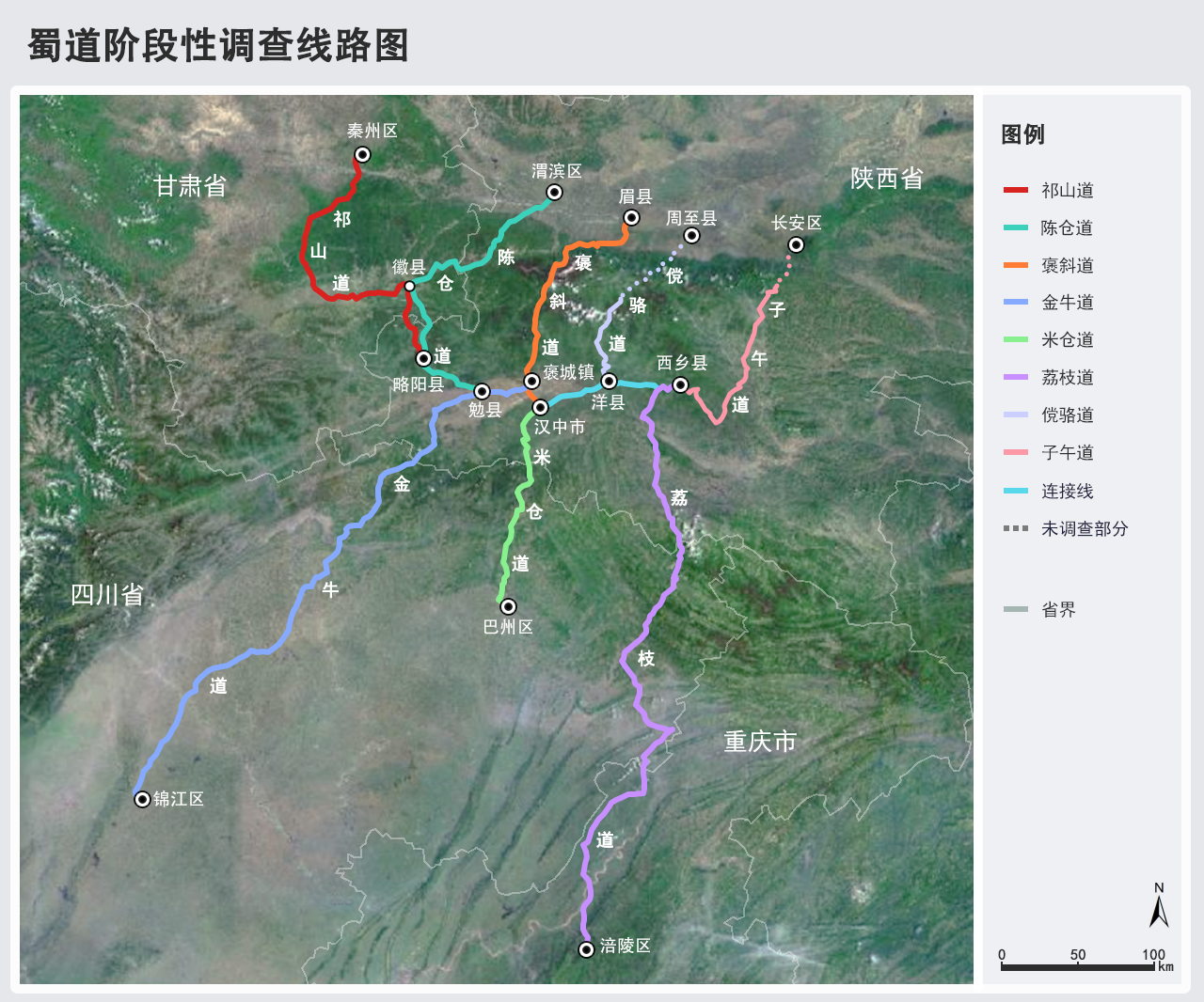 在此次工作中,共設立了6個專項任務,其中,除了不跨省域的褒斜道和祁山道由所在省的文物考古科研機構獨自完成外,跨省域的陳倉道的調查工作由陝西省考古研究院牽頭負責,甘肅省文物考古機構協助完成;金牛道、米倉道由四川省文物考古研究院牽頭負責,陝西省、甘肅省文物考古機構協助完成;荔枝道由重慶市文物考古研究院牽頭負責,四川省、陝西省文物考古機構協助完成。除各省考古機構外,在調查過程中還邀請了國內相關高校、地方文博單位和社會各界共同參與,結合全國第四次文物普查,最終形成了系統調查與專項普查相結合的新局面。