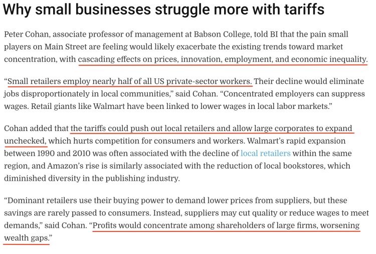 美國商學院巴布森學院管理學副教授彼得·科恩認為,鑑於小型零售商僱傭了美國私營部門近一半的工人,他們的減少將不成比例地減少當地社區的就業機會。關税還可能會把當地零售商擠出市場,讓大公司不受限制地擴張。