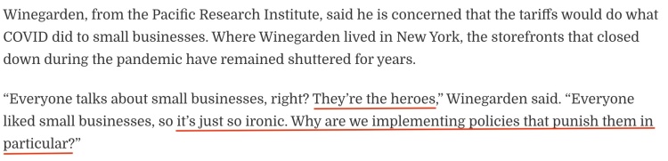 維恩加登就此發出靈魂拷問:“每個人都在談論小企業,他們是英雄。大家都喜歡小企業,所以這太諷刺了。為什麼我們要用關税懲罰它們?”