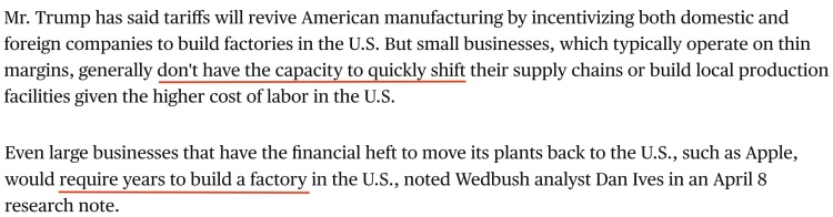 韋德布什證券公司分析師艾夫斯在一份研究報告中指出,即使是像蘋果公司這樣有財力將工廠遷回美國的大型企業,也需要數年時間才能在美國建廠。