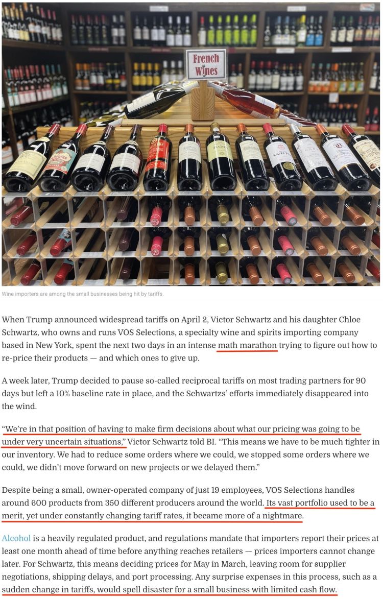 當美國總統特朗普4月2日宣佈大範圍徵收所謂“對等關税”時,經營着一家總部位於紐約的專業葡萄酒和烈酒進口公司的維克多·施瓦茨和女兒進行了一場激烈的數學馬拉松,試圖想出如何重新定價他們的產品以及放棄哪些產品。但一週後,特朗普又決定暫停對部分貿易伙伴徵收“對等關税”90天,但仍保留10%的最低基準税率,施瓦茨父女的努力一下白白浪費了。