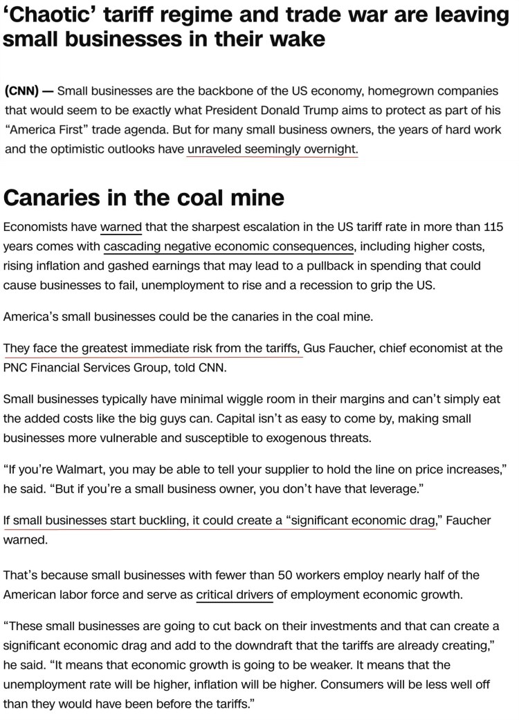 經濟學家警告稱,特朗普政府的關税政策將帶來一連串負面的經濟後果,包括成本上升、通脹上升和收入減少,這可能導致支出減少,進而導致企業倒閉、失業率上升和經濟衰退籠罩美國,而美國的小企業可能是“煤礦裏的金絲雀”(注:指的是一種預警信號或危險即將出現的風向標)。