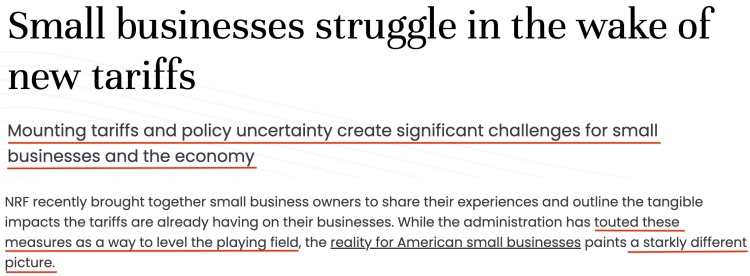 美國全國零售商聯合會指出,雖然政府吹捧這些措施是公平競爭的一種方式,但美國小企業的現實卻描繪了一幅截然不同的畫面。不斷增加的關税和政策不確定性給小企業和經濟帶來了重大挑戰。