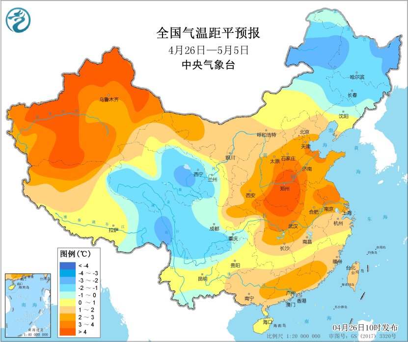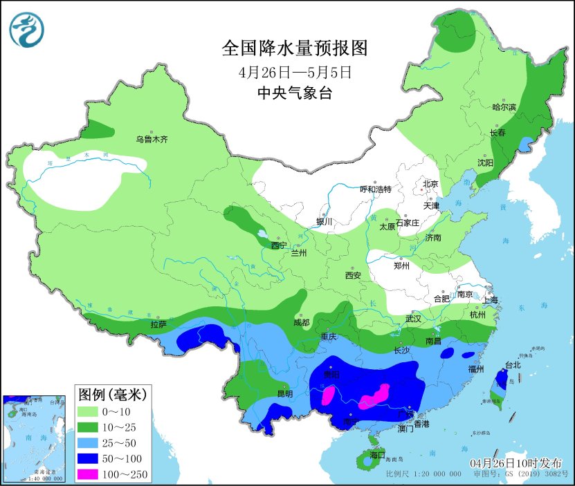 未來10天(4月26日-5月5日),江南南部、華南以及貴州等地累計降水量有30~60毫米,部分地區有80~120毫米,局地超過150毫米;青海北部和東部、內蒙古東北部和東北地區東部等地的部分地區累計降水量有10~20毫米;上述大部地區累計降水量較常年同期偏多2~6成,局地偏多1倍以上。