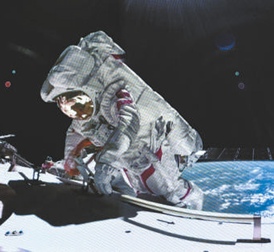 神舟十七號航天員湯洪波在空間站組合體艙外作業畫面。