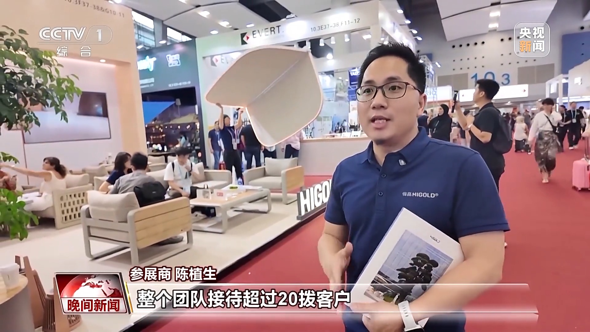在廣交會現場,全球客商並沒有感受到中國企業因關税衝擊帶來信心減弱。傳統制造企業選擇“品牌出海”戰略,從被動接單到主動輸出品牌和標準,以創新設計與技術突破為亮點,實現傳統產業向高端化、智能化的轉變,從賣產品到賣品牌的升級。户外家居館的展位上,參展商正在展示一款不久前剛剛斬獲國際大獎的遮陽傘。