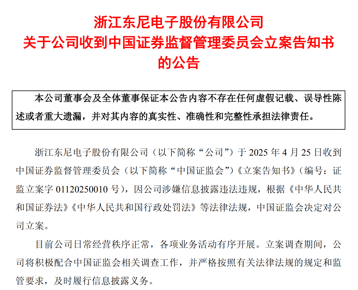 【環球網財經綜合報道】4月26日,據東尼電子發佈的公告,該公司於2025年4月25日收到中國證監會《立案告知書》(編號:證監立案字 01120250010 號),因公司涉嫌信息披露違法違規,決定對公司立案。