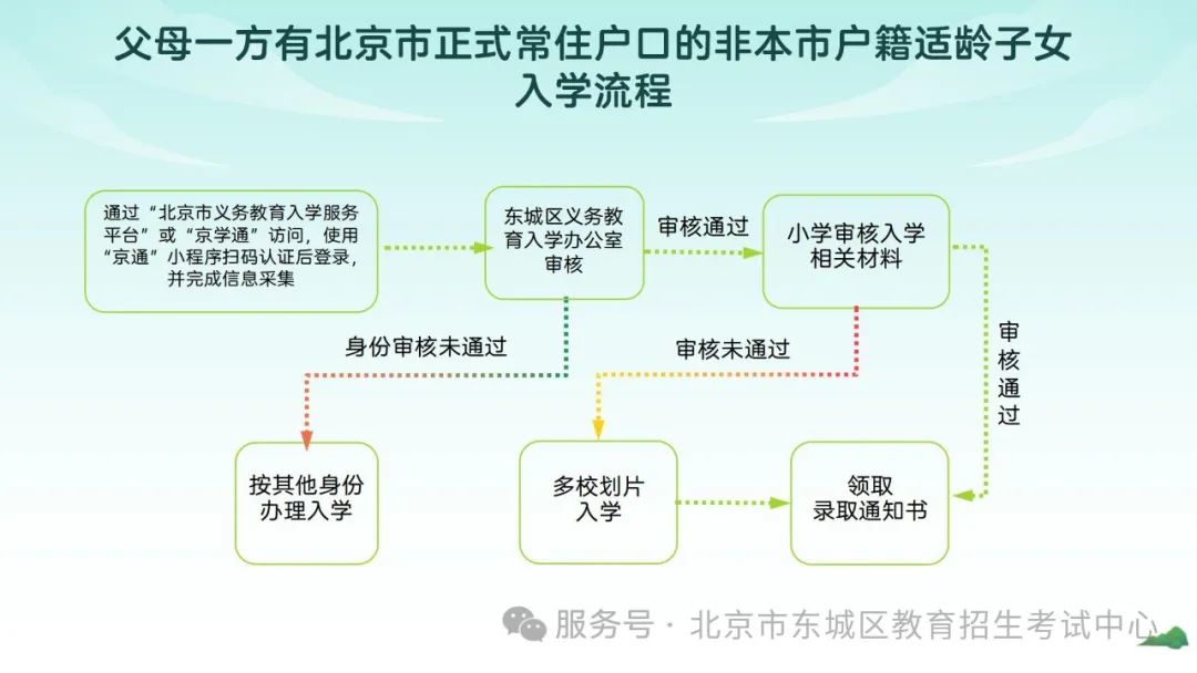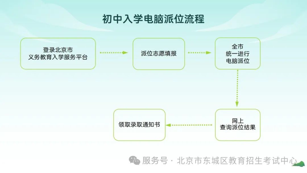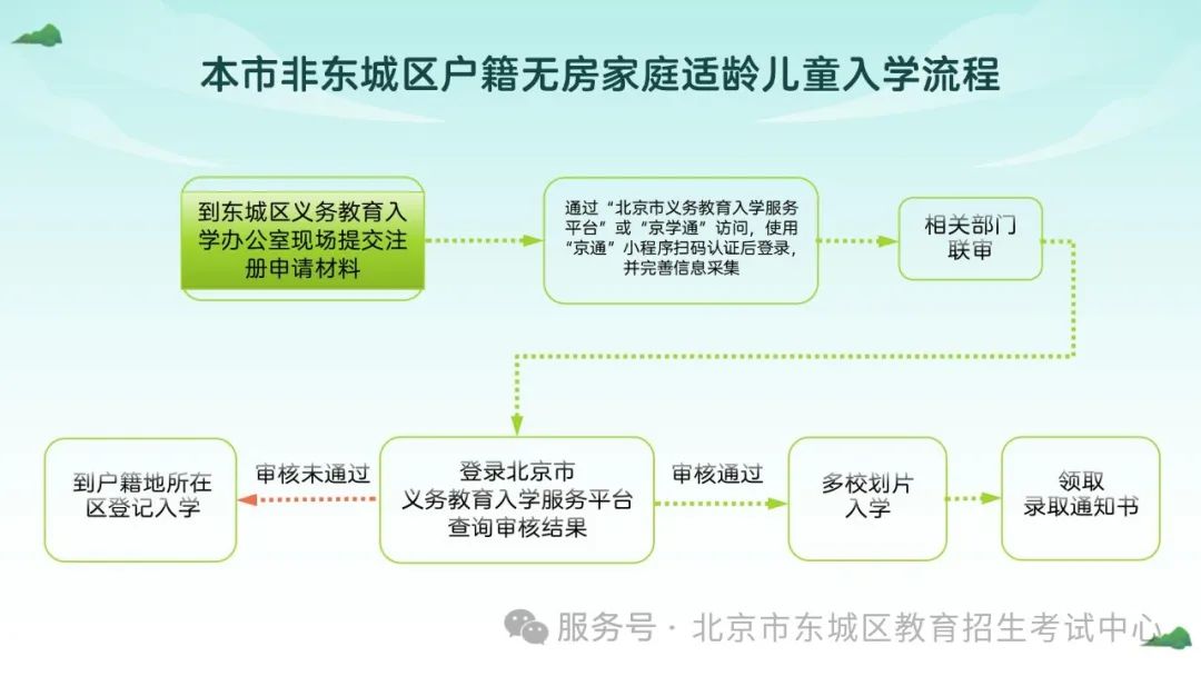 凡年滿6週歲(2019年8月31日以前出生)的具有東城區户籍、東城區房屋產權證(法定監護人持有)的適齡兒童,均須參加學齡人口信息採集,免試就近入學。小升初時,東城區通過一般初中(優先發展初中)登記入學、全區派位和學區服務片派位安排入學。