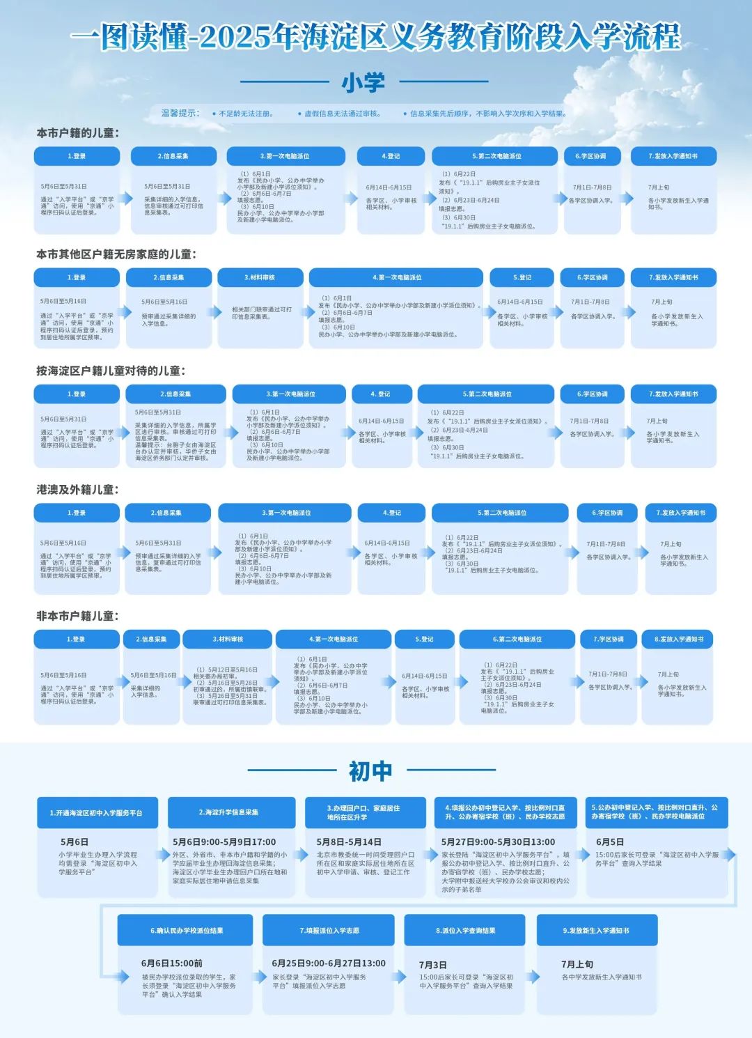 海淀區教委介紹,今年入學政策總體保持穩定:繼續堅持免試就近的原則,小學入學以登記入學為主、單校劃片和多校劃片相結合的方式,小升初按志願派位方式入學。該區將繼續執行户籍、房產、新建學校三類規範性政策,合理穩定社會和家長預期,形成更加公平完善的入學規則。