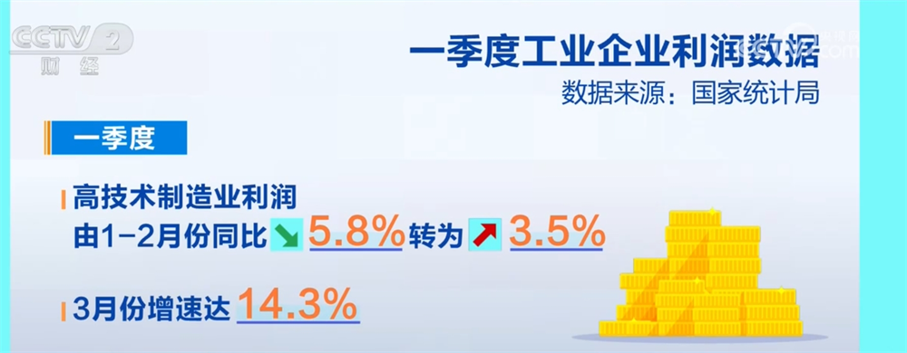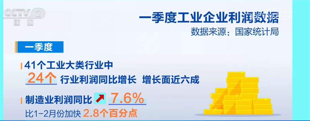 一季度,在41個工業大類行業中,有24個行業利潤同比增長,增長面近六成;其中,製造業改善明顯,一季度利潤增長7.6%,比1—2月份加快2.8個百分點。其中,裝備製造業成為利潤增長的重要支撐。特別是鐵路船舶航空航天、儀器儀表、專用設備等行業利潤增長較快。