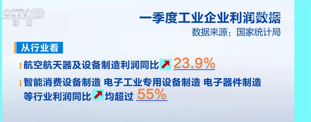 此外,一季度,高技術製造業利潤也明顯改善,由1—2月份同比下降5.8%轉為增長3.5%;其中,3月份增速達14.3%。從行業看,在航空航天產業高速發展的背景下,航空航天器及設備製造利潤增長23.9%;人工智能領域創新持續推進,帶動智能消費設備製造、電子工業專用設備製造、電子器件製造等行業利潤增長均超過55%;醫療器械高質量發展效果顯現,帶動醫療儀器設備及器械製造利潤增長12.5%。