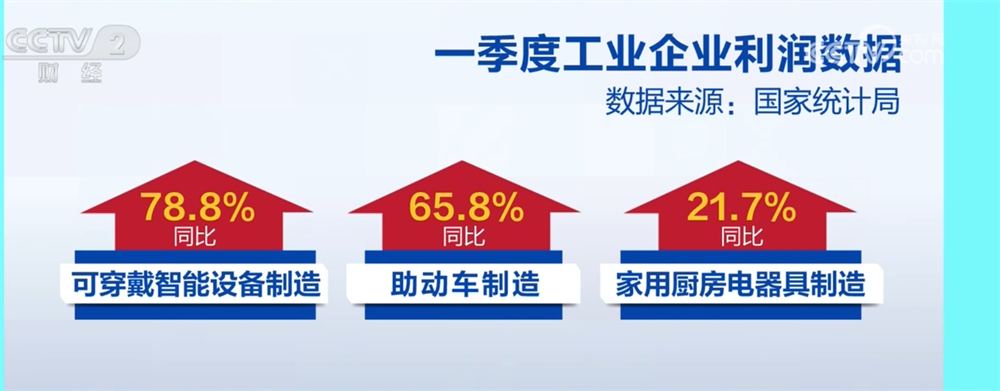 而在消費品以舊換新等政策帶動下,可穿戴智能設備製造、助動車製造、家用廚房電器具製造等行業利潤分別增長78.8%、65.8%、21.7%,相關鏈條行業中的電子電路製造、家用電力器具專用配件製造等行業利潤均實現兩位數的快速增長。
