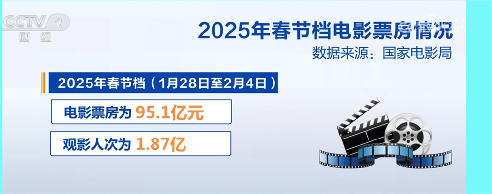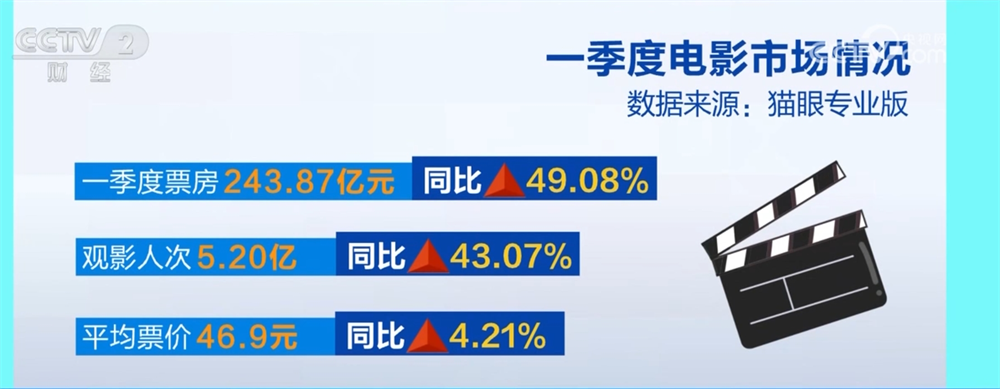 數據顯示,一季度票房243.87億元,同比增長49.08%;觀影人次5.20億人,同比增長43.07%;平均票價46.9元,同比增長4.21%。此外,2025年春節檔(1月28日至2月4日)電影票房為95.1億元,觀影人次為1.87億人,創造了新的春節檔票房和觀影人次紀錄。
