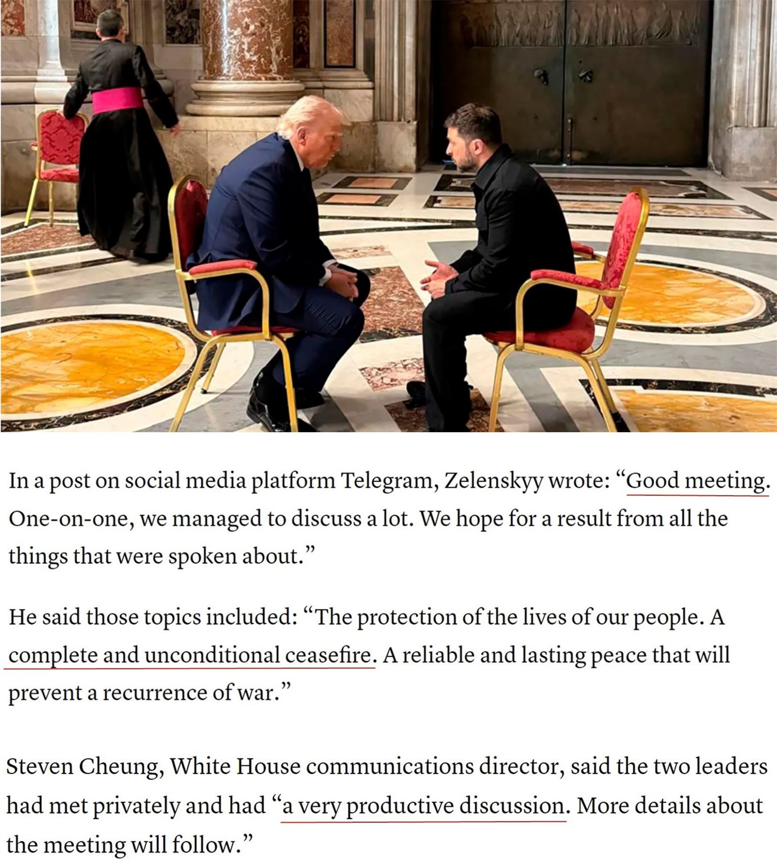 當地時間26日,烏克蘭總統澤連斯基在梵蒂岡和美國總統特朗普進行了15分鐘短暫的面對面交流。澤連斯基強調,實現全面、無條件停火以及建立可靠而持久的和平,防止戰爭再次爆發是他期望達成的目標。