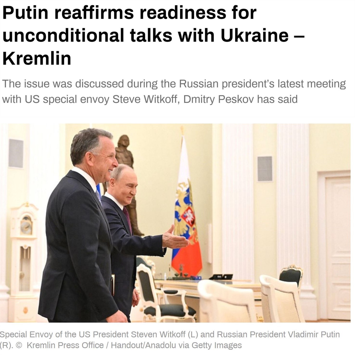 俄羅斯總統新聞秘書佩斯科夫26日在回答媒體提問時説,普京總統25日在與美國中東問題特使威特科夫會晤時確認,俄方準備在不設先決條件的情況下與烏方談判。佩斯科夫強調,普京此前曾多次表明上述立場。