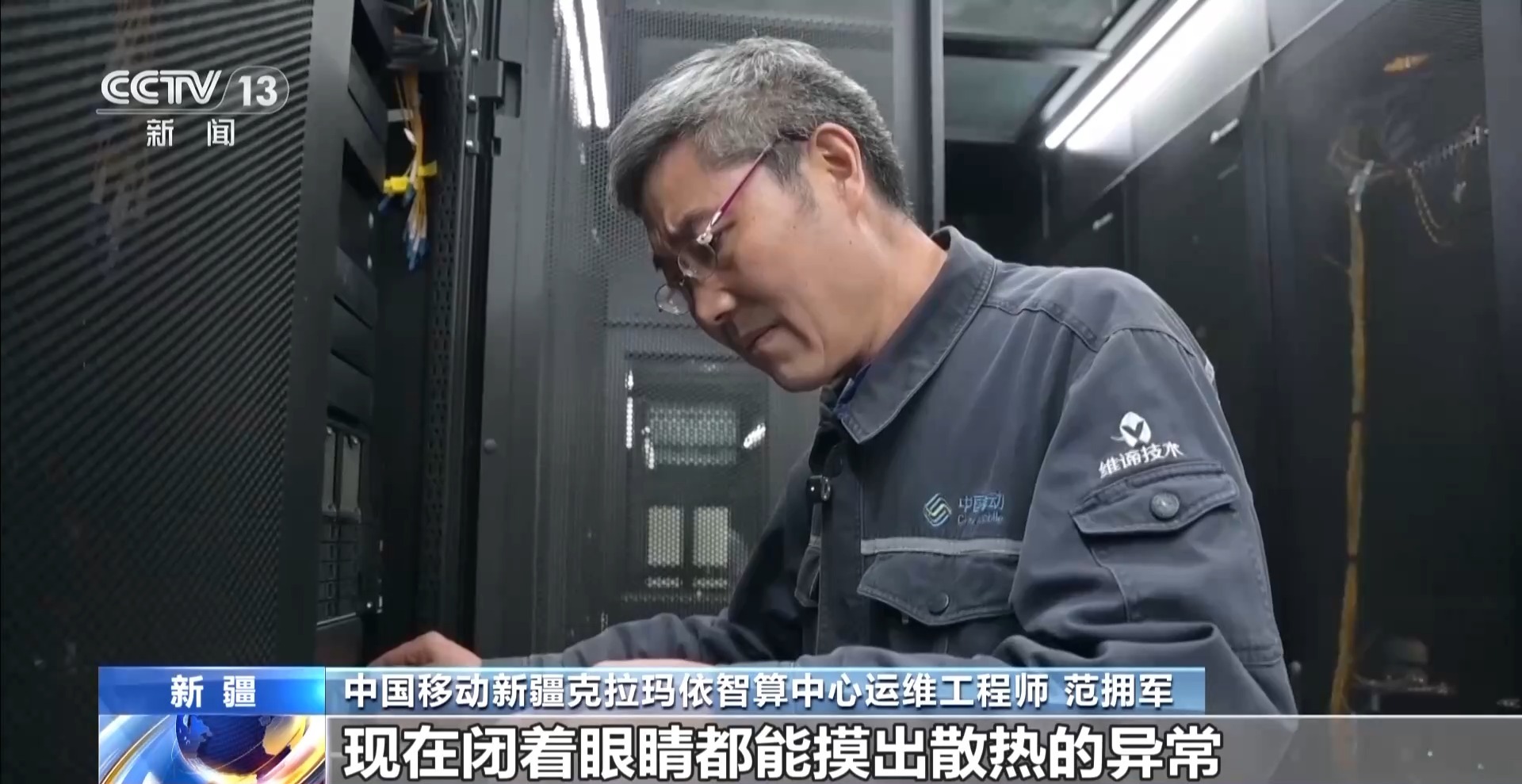 *中國移動新疆克拉瑪依智算中心運維工程師 範擁軍:*剛開始的時候,我連服務器機櫃都不敢碰,現在閉着眼睛都能摸出散熱的異常。