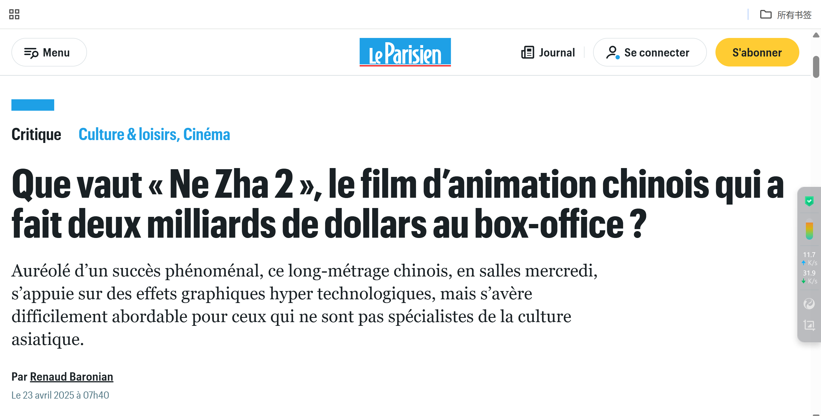 在法國權威電影網站Allocine上,《哪吒2》收穫了主流媒體3星、觀眾4.3星(滿分5星)的超高評價。法國《觀點週刊》評論稱:“《哪吒2》展示了無窮的想象力,從各路神仙到史詩般的廣角鏡頭,令人眩目。哪怕劇情不能完全看懂,它也是一部非常美妙的作品。”同時,《巴黎人報》也指出,雖然部分觀眾可能因不瞭解中國歷史和神話而難以完全理解故事情節中的微妙之處,但該片憑藉其出色的口碑和精緻的畫面水平,依然贏得了廣泛的讚譽。