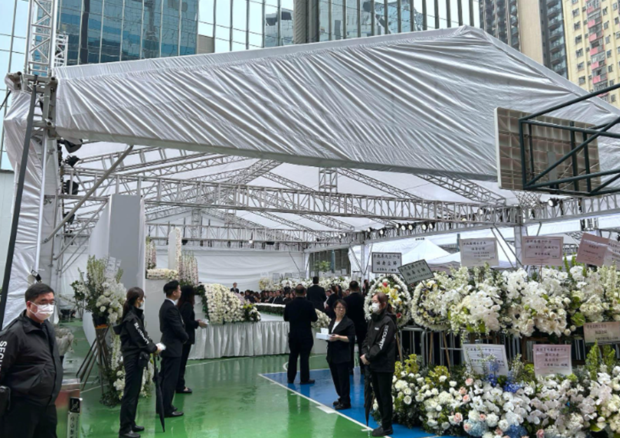 李兆基團體公祭28日在香港殯儀館舉行,在殯儀館對面設有一個大型帳篷悼念區。圖源:港媒