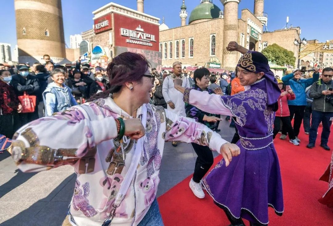 舞蹈演員與遊客在大巴扎景區共同跳起舞蹈。