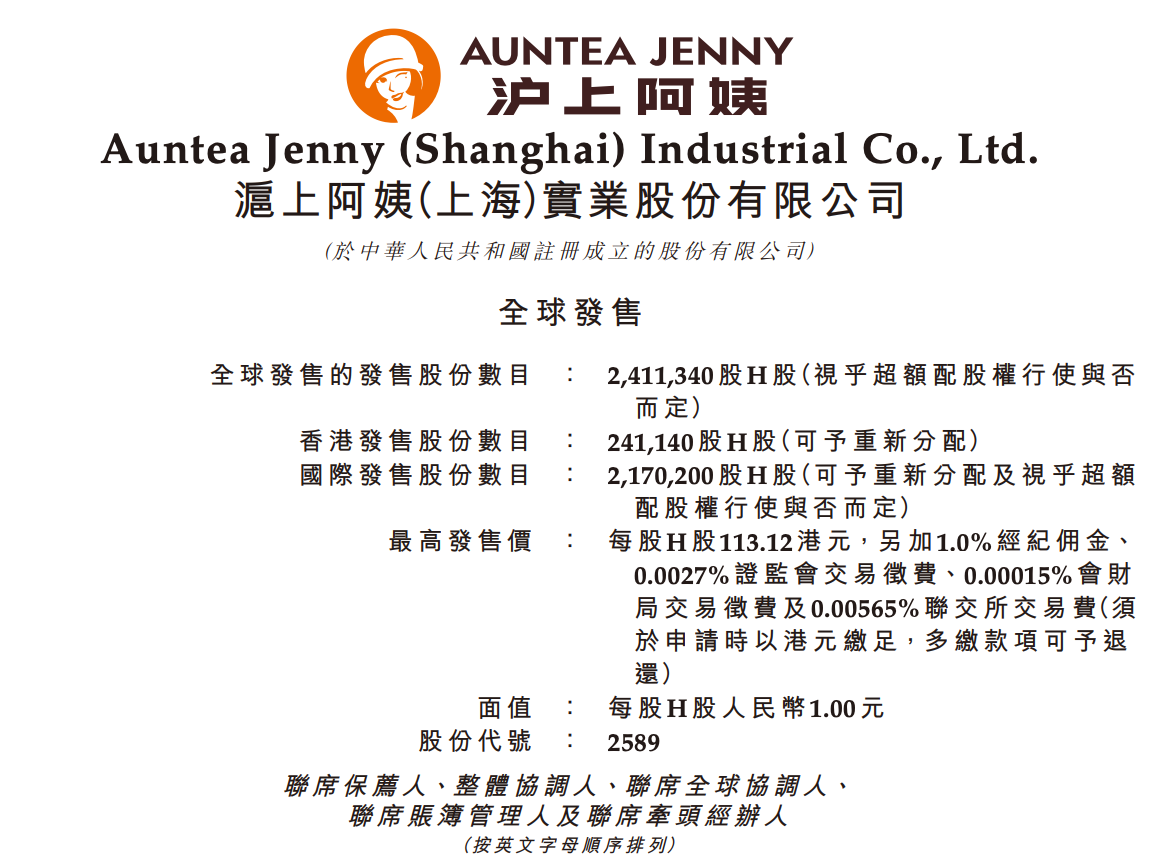 【環球網財經綜合報道】4月28日,滬上阿姨啓動招股,擬發行241.134萬股H股,其中香港公開發售佔10%,國際配售佔90%,並設15%超額配股權,定價區間為每股95.57至113.12港元,預計於5月8日登陸港交所主板。