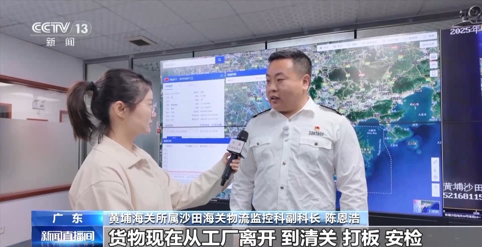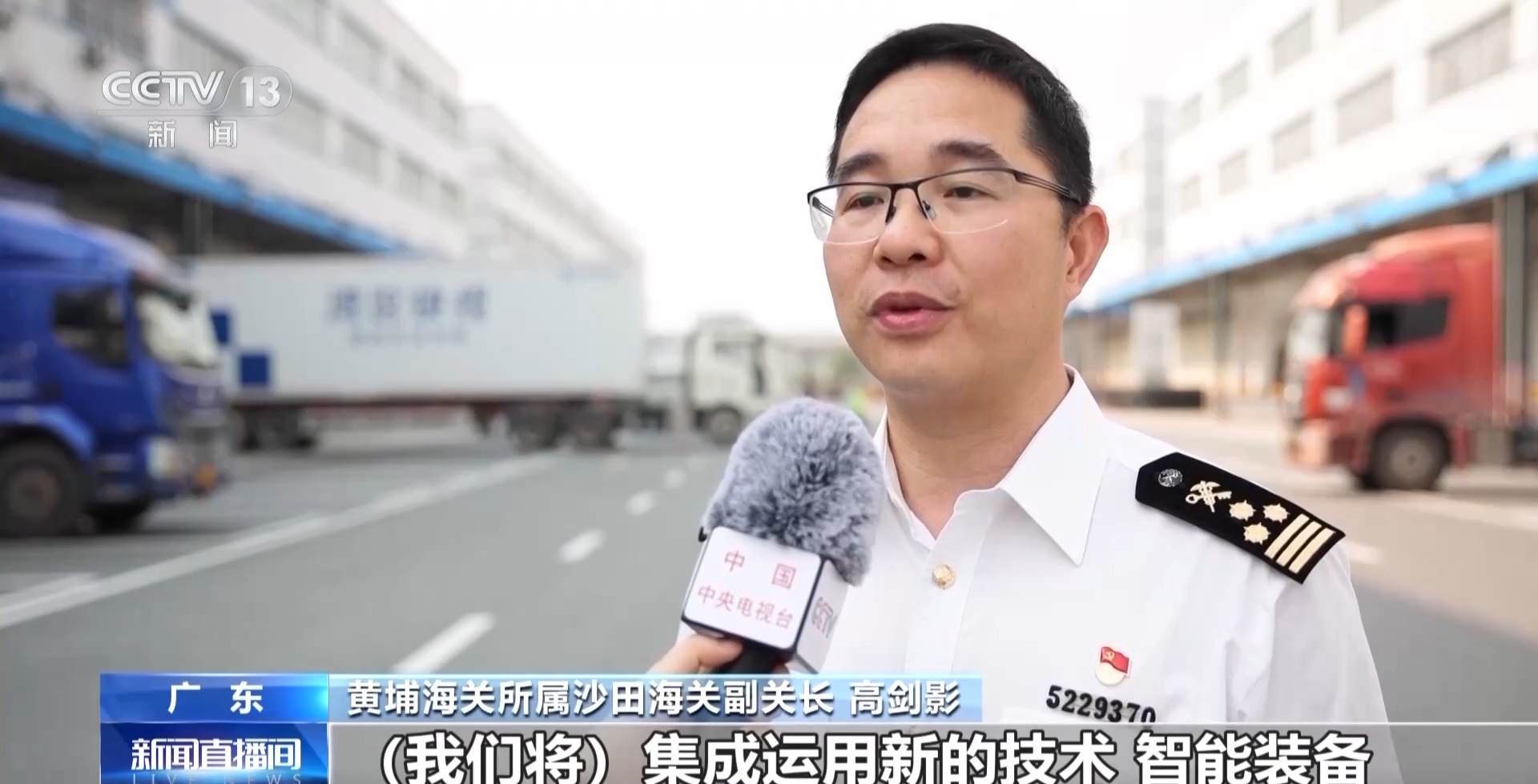 *黃埔海關所屬沙田海關物流監控科副科長 陳恩浩:*貨物現在從工廠離開,到清關、打板、安檢、裝船以及發運整個環節,最快可以在14個小時內完成。我們還在不斷優化流程、提高效率,未來預計還可以節約2到3小時。
