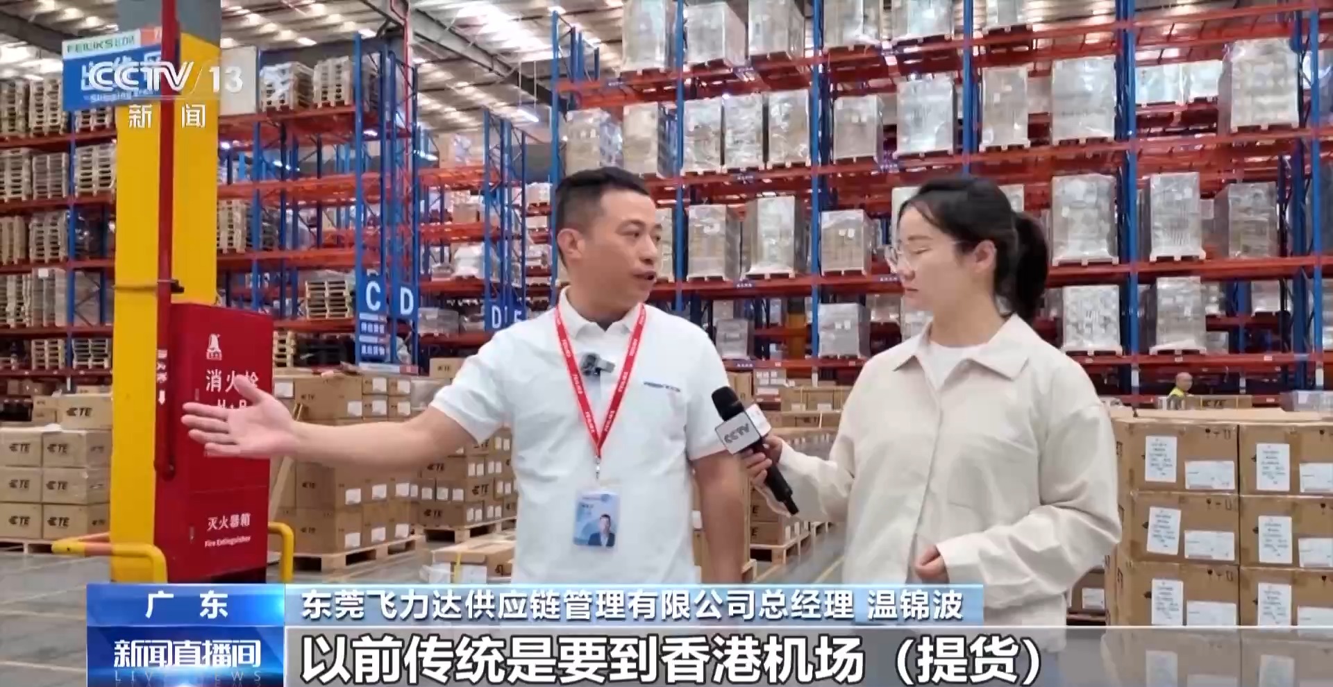 *東莞飛力達供應鏈管理有限公司總經理 温錦波:*以前傳統是要到香港機場提貨,現在不用拆包、不用申報,直接拉到空港中心,再進行一站式的進口申報。在我們家門口500米,就可以提回來倉庫,非常方便。