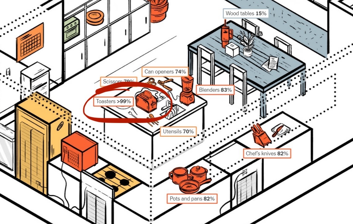 走進美國家庭的廚房,大量用品刻着深深的“中國製造”烙印。美國所有的家用烤麪包機都是進口的,而且幾乎每一台都來自中國,這一商品從中國的進口率達到了99%以上。