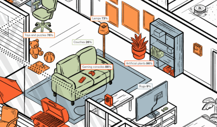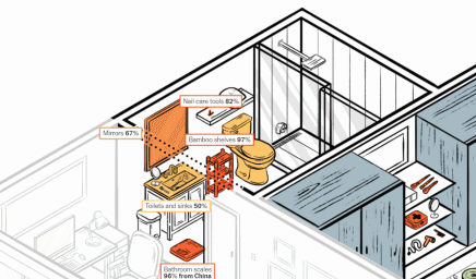 △《紐約時報》可視化報道,展現一個普通美國家庭對中國進口產品的依賴比例程度。灰色表示這一品類從中國進口率為0-20%,綠色為20%-40%,黃色為40%-60%,橙色為60%-80%,紅色為80%-100%