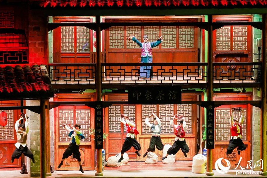 王龍濤(上)飾演茶掌櫃帶領茶廠的夥計,為五湖四海的茶商計算“武夷四大名樅”的價格。人民網 李唯一攝