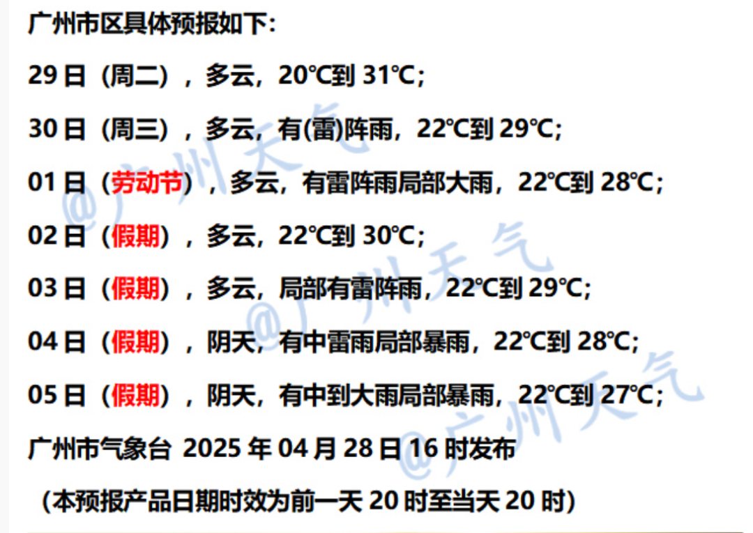 其中假期首尾兩端(4月30日夜間—5月1日、5月3日夜間—5日),粵北和珠江三角洲市縣有中到大雨,局部暴雨 ,廣東其餘市縣多雲有(雷)陣雨,雷雨時伴有7~10級短時大風,大部分市縣有(輕)霧。