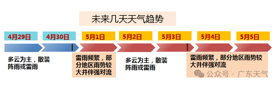 • 5月3日夜間—5日 ,粵北和珠江三角洲市縣多雲到陰天,有中到大雨局部暴雨,並伴有7~10級短時大風和雷電,其餘市縣多雲,有(雷)陣雨。