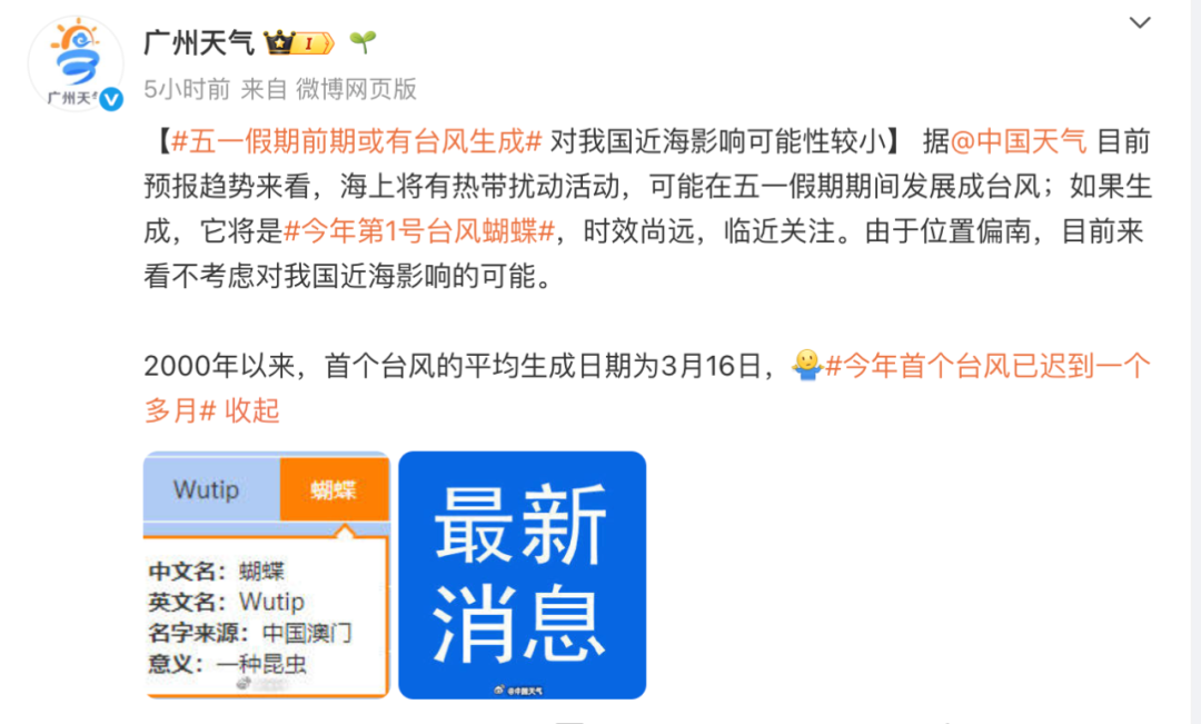 據@中國天氣 目前預報趨勢來看,海上將有熱帶擾動活動 ,可能在五一假期期間發展成颱風;如果生成,它將是今年第1號颱風蝴蝶 ,時效尚遠,臨近關注。 由於位置偏南,目前來看不考慮對我國近海影響的可能。