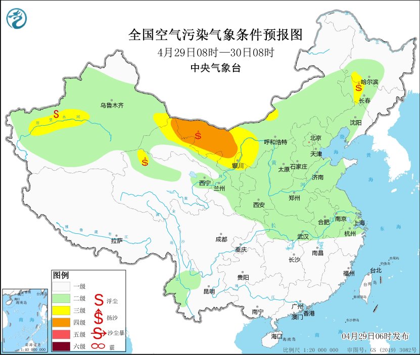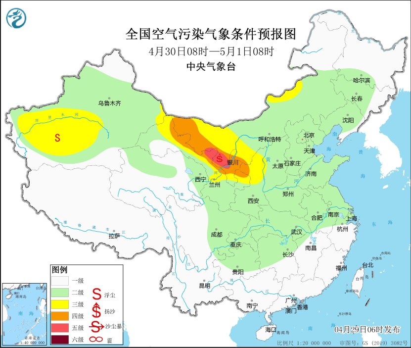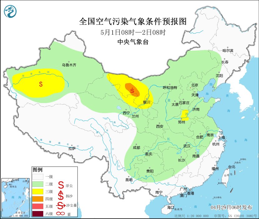 4月29日至5月1日,新疆東部、內蒙古西部、甘肅河西、寧夏中北部等地的部分地區有揚沙或浮塵天氣。5月2日至3日,新疆東部和南部、內蒙古西部、甘肅河西等地的部分地區有揚沙或浮塵天氣,局地有沙塵暴。此外,5月4日起,內蒙古中西部、西北地區東部等地的部分地區自西向東有沙塵天氣。