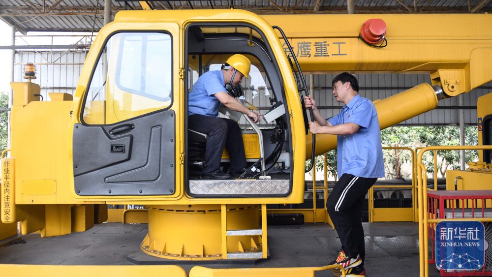 彭春林(左)在柳州動力設備車間檢查接觸網作業車防傾覆裝置使用情況(4月25日攝)。