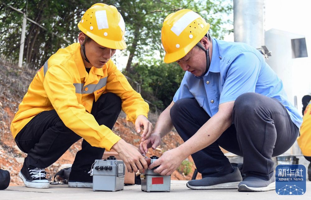 彭春林(右)在國鐵南寧局職工培訓基地指導青年職工使用電極型接地儀測試卡(4月25日攝)。