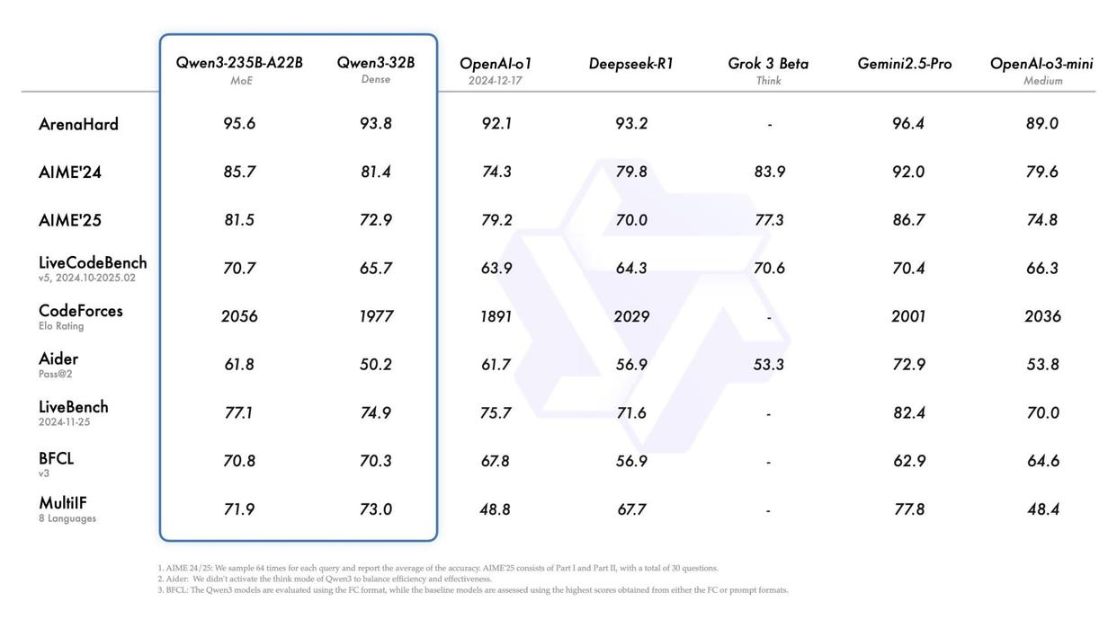 4月29日凌晨,阿里巴巴開源新一代通義千問模型Qwen3(簡稱千問3),參數量僅為DeepSeek-R1的1/3,成本大幅下降,性能全面超越R1、OpenAI-o1等全球頂尖模型,登頂全球最強開源模型。千問3是國內首個“混合推理模型”,“快思考”與“慢思考”集成進同一個模型,對簡單需求可低算力“秒回”答案,對複雜問題可多步驟“深度思考”,大大節省算力消耗。