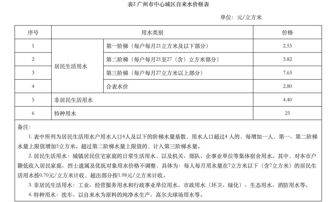 自2025年6月1日起,廣州市中心城區自來水價格將進行調整,即居民生活用水第一、二、三階梯價格調整為2.55元/立方米、3.82元/立方米、7.65元/立方米,並增設合表水價2.80元/立方米;非居民生活用水價格調整為4.40元/立方米;特種用水價調整為25元/立方米。