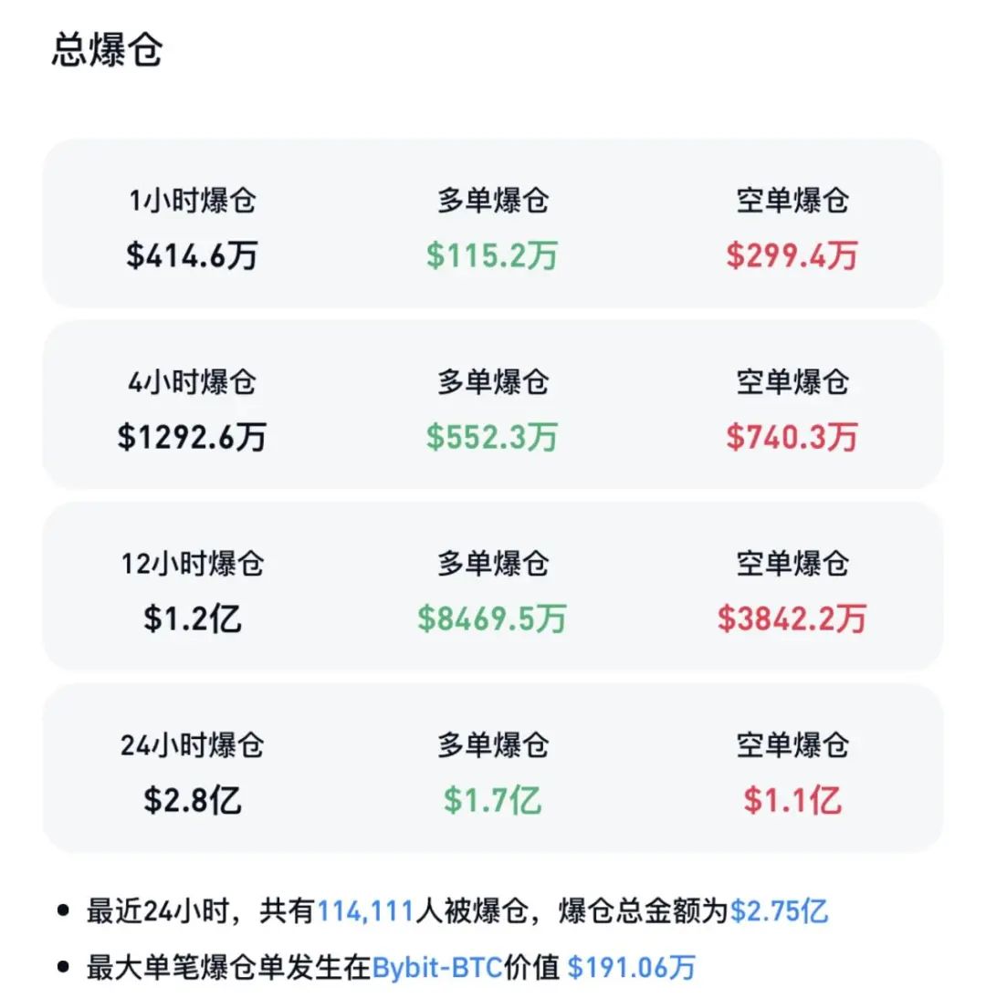Coinglass數據顯示,過去24小時加密貨幣市場共有超11萬人被爆倉,爆倉總金額為2.75億美元,其中多單爆倉1.7億美元,空單爆倉1.1億美元。