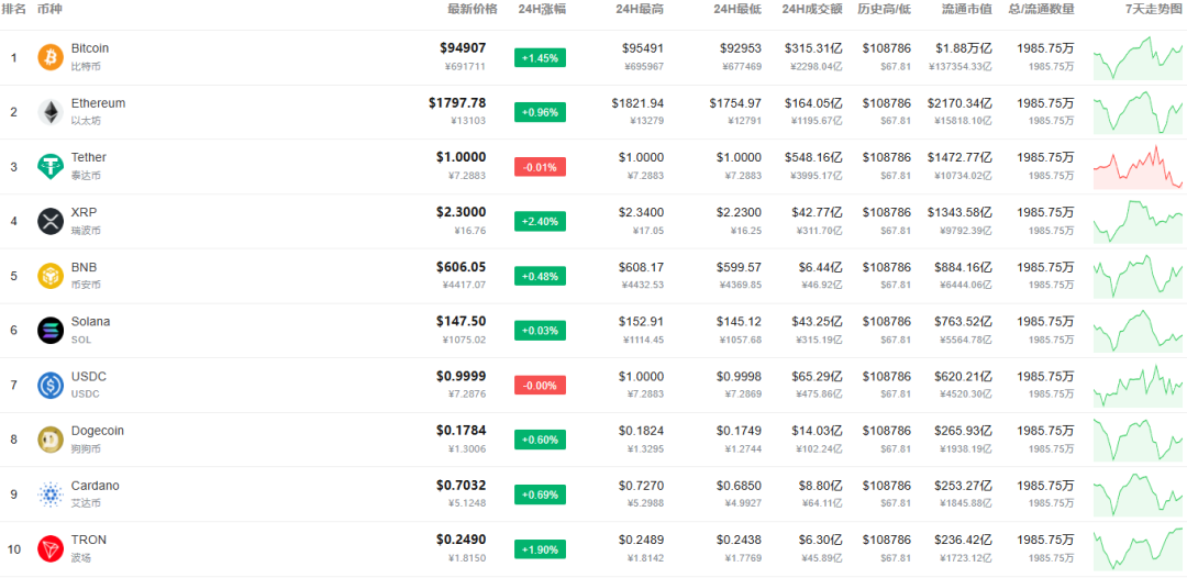 其他加密貨幣市場多數走高,瑞波幣漲超2%,以太坊、幣安幣、狗狗幣均實現上漲。