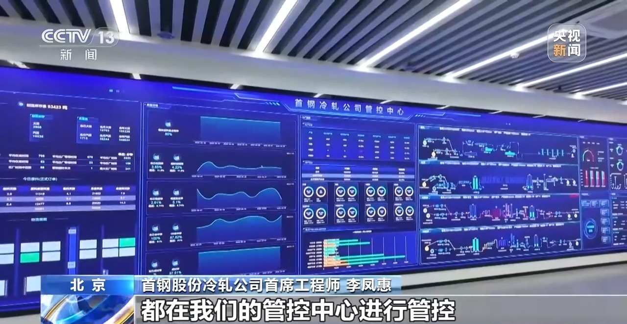 *首鋼股份冷軋公司首席工程師 李鳳惠:*這是我們的智慧管控中心,智慧管控中心是我們公司核心的管控大腦,所以我們所有的生產、質量、倉儲、物流到能源環保安全,所有的這些業務都在我們的管控中心進行管控。