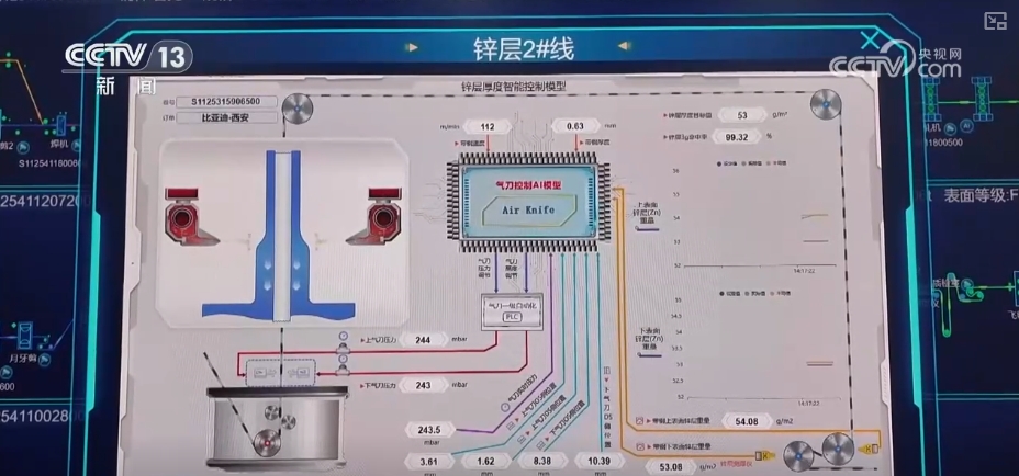 其中,鍍鋅工藝是核心環節,尤其是汽車板生產對鍍鋅精度要求極高。鋼板鍍鋅工藝就像給鋼板穿上一層“防鏽衣”,通過鐵鋅合金化反應隔絕腐蝕介質。在連續熱鍍鋅產線現場,鋼板以每分鐘180米的速度快速通過450攝氏度高温熔化的鋅液,鐵和鋅在高温下“融合”,鋼板表面形成一層堅固的合金層。過去,這類工藝依賴老師傅憑經驗反覆調試參數。現在,只需要技術人員點點鼠標就可以實現了。