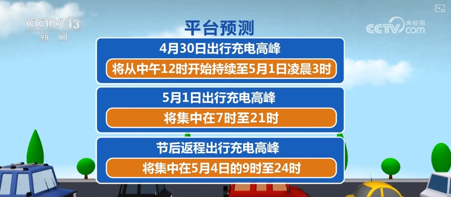 平台預測,“五一”假期期間的出行充電高峯將集中在4月30日至5月1日。其中,4月30日出行充電高峯將從中午12時開始持續至5月1日凌晨3時,5月1日出行充電高峯將集中在7時至21時;節後返程出行充電高峯將集中在5月4日的9時至24時。