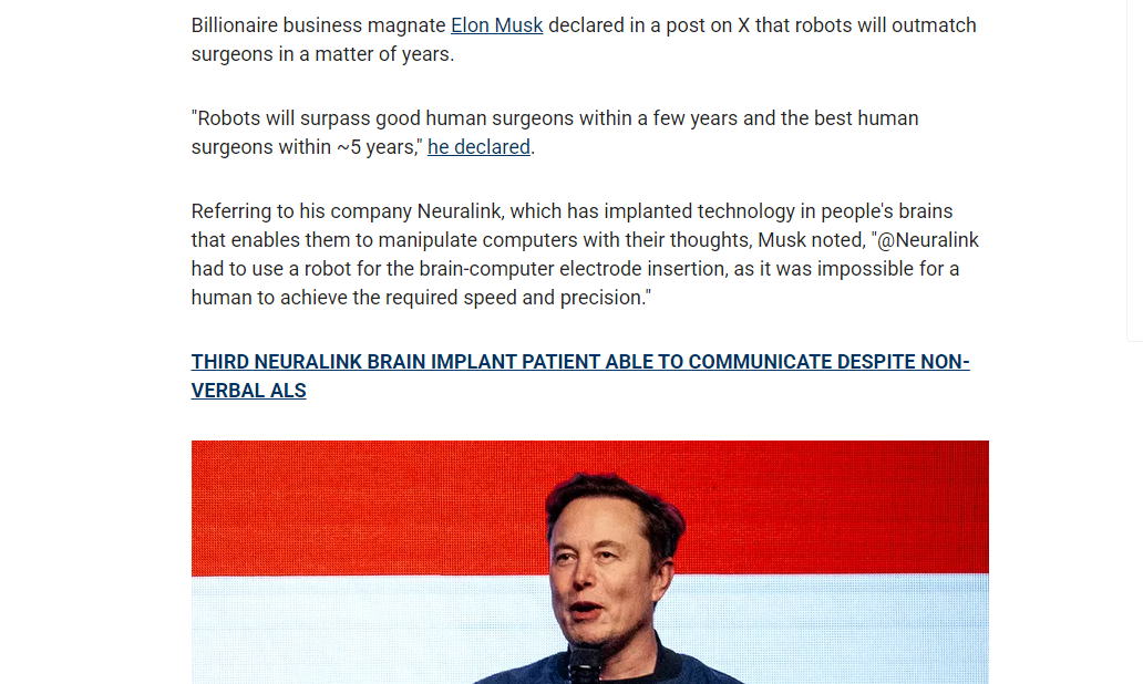 馬斯克以旗下公司Neuralink為例,強調了機器人在高精度操作中的不可替代性。他稱Neuralink的R1機器人能在大約15分鐘內將64根髮絲般細的電極絲插入大腦皮層,並以微米級精度避開血管。“Neuralink在進行腦機接口電極植入時,依靠機器人實現了人類難以企及的速度和精度。”